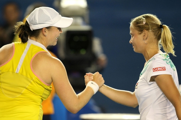 Jelena Dokic (R) shakes hands with Alisa Kleybanova after winning their fourth-round match at Australian Open 2009. (Getty Images)